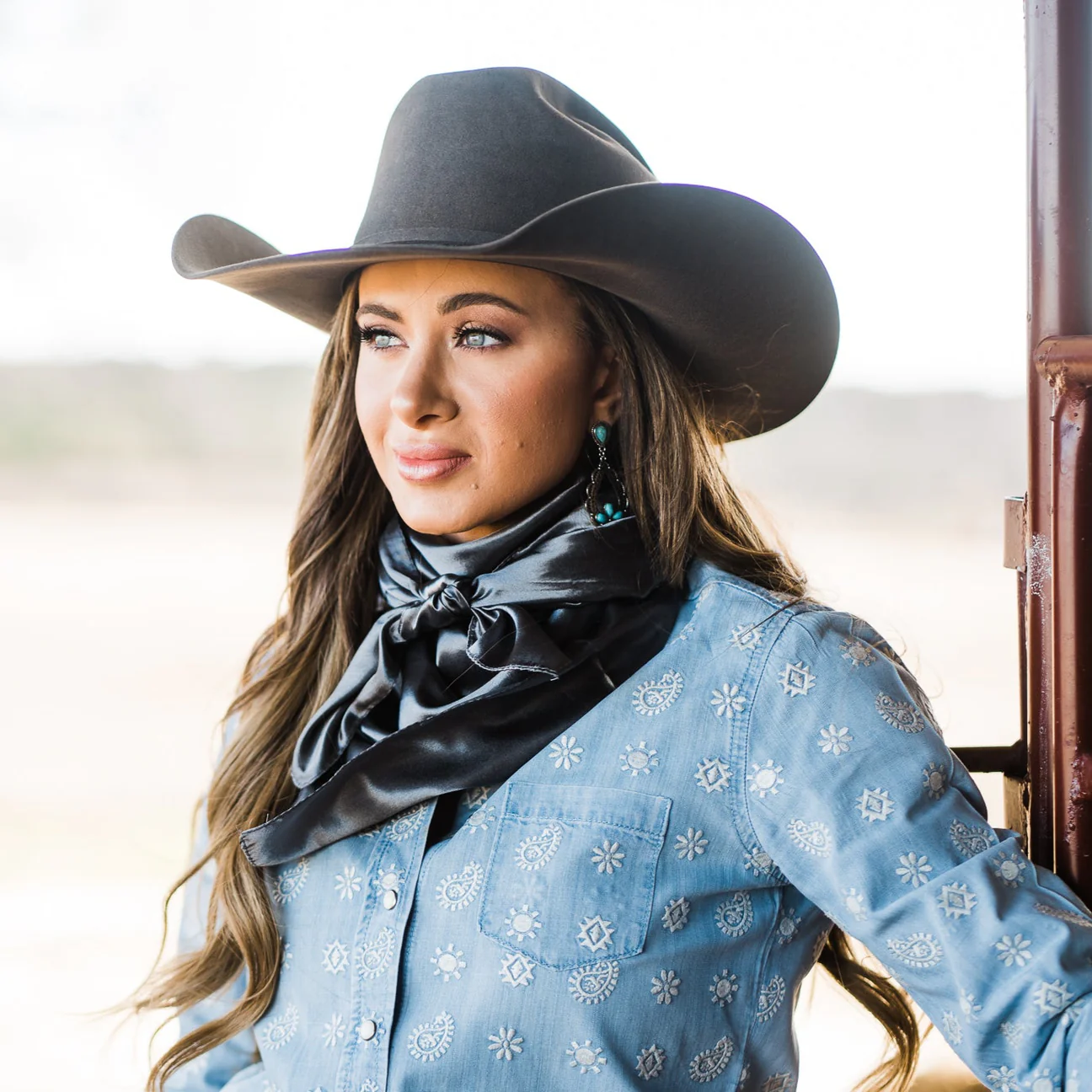 Our classic wild rag / scarf in solid silver/grey color. A perfect square - measuring 35"x35". Adding that extra touch of a western style to your outfit. 100% soft silky feeling polyester is durable to keep you warm in the cold and fashionable for any occasion. Plus it's machine washable!