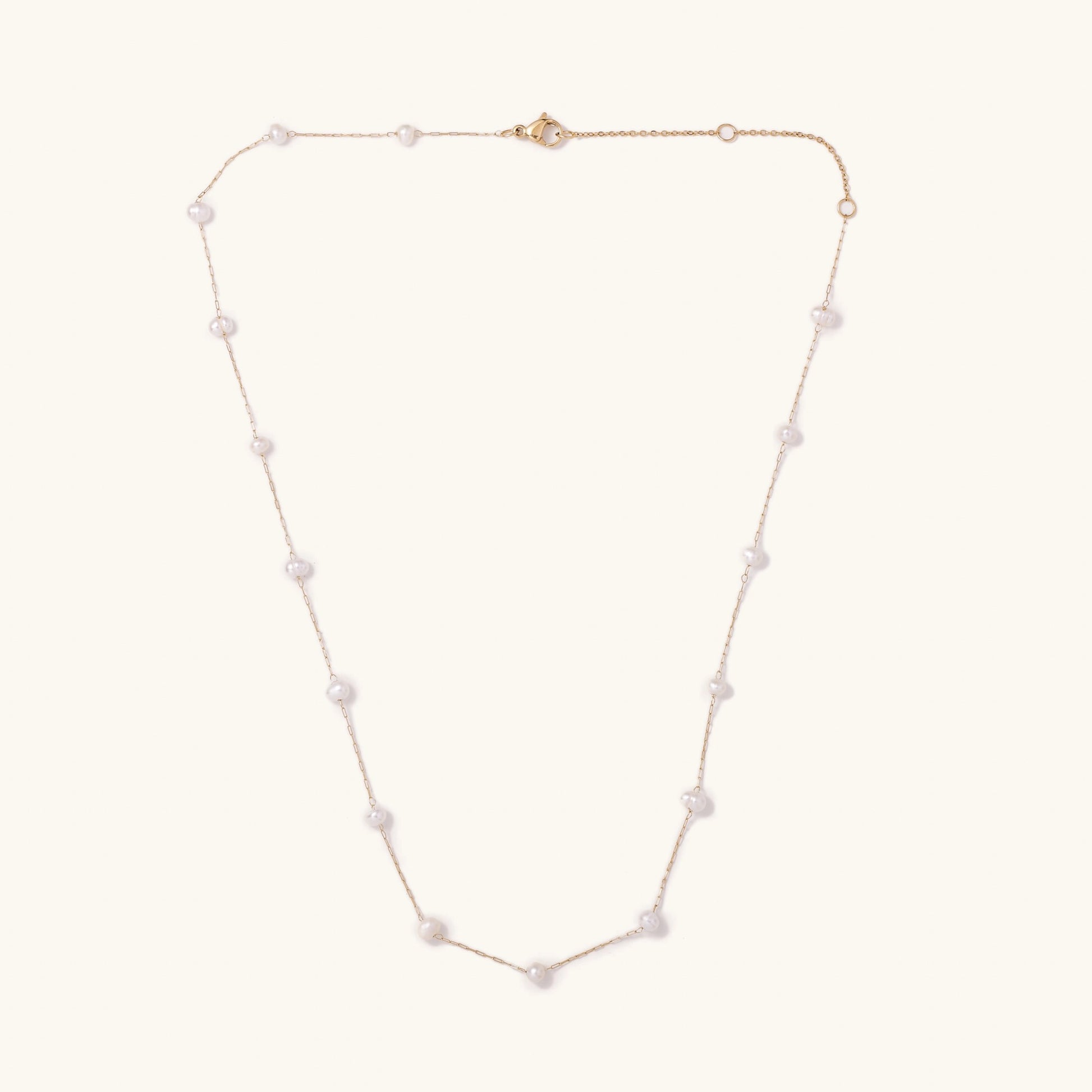 It's easy to see why everyone loves this beauty so much! This necklace is simply a must have this season. Waterproof material- stainless steel with 14k gold plating Freshwater pearls 14 inches with a 2.5 inch extender