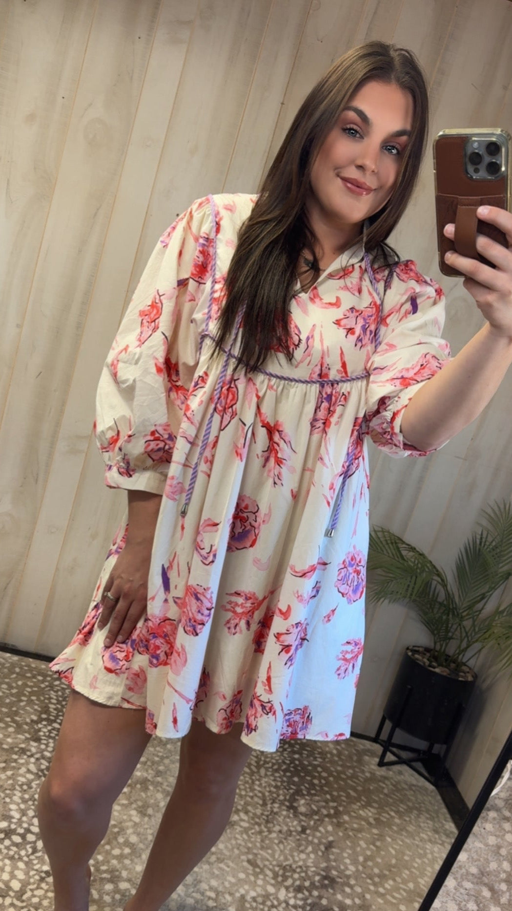 Introducing our dress, perfect for any spring or summer event. With its charming floral print, this dress adds a touch of nature's beauty to your wardrobe. The balloon sleeves and V-neck give a romantic and playful look, while accessories like necklaces, earrings, and handbags complete the ensemble. Don't miss out on this must-have dress!