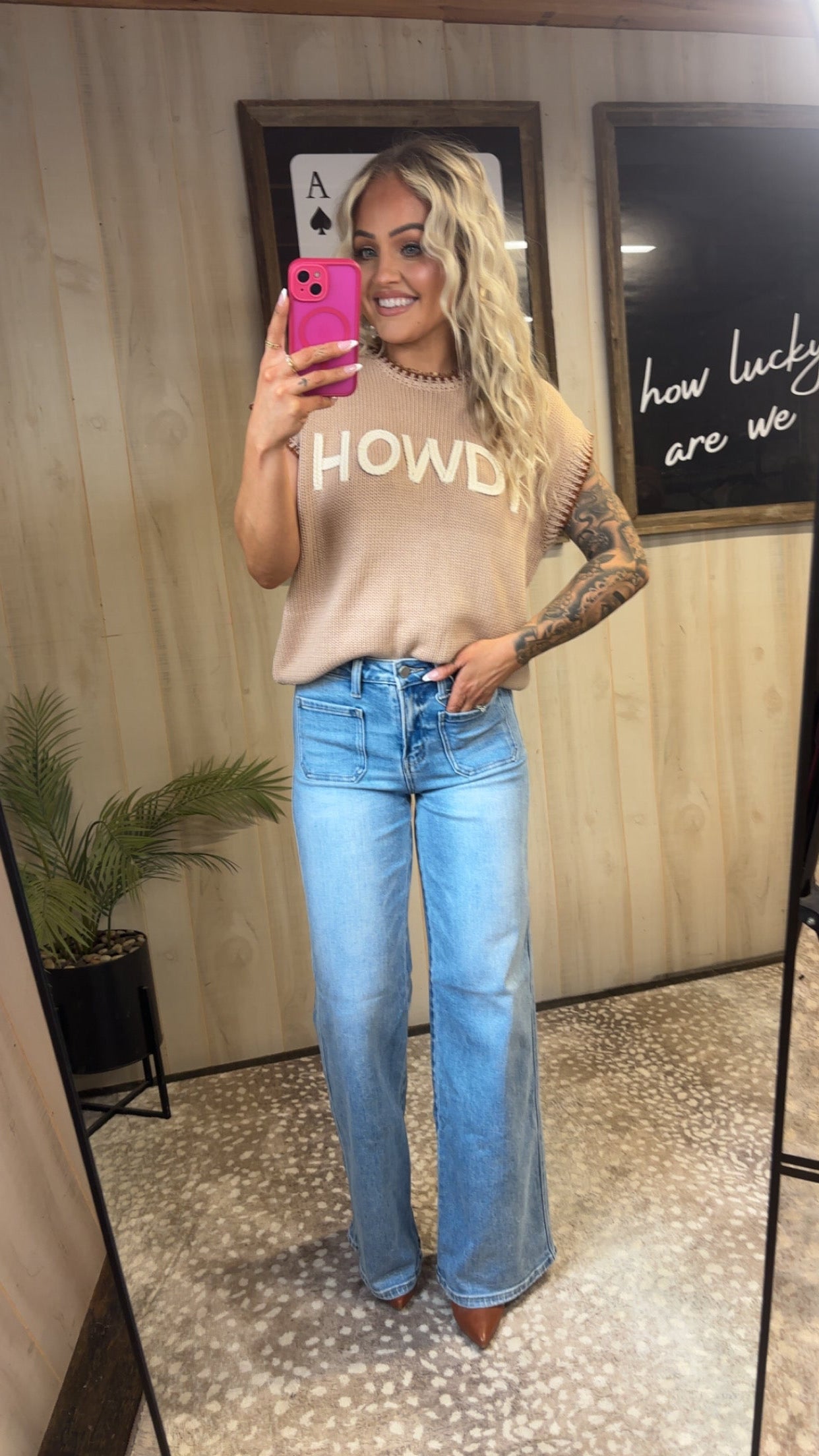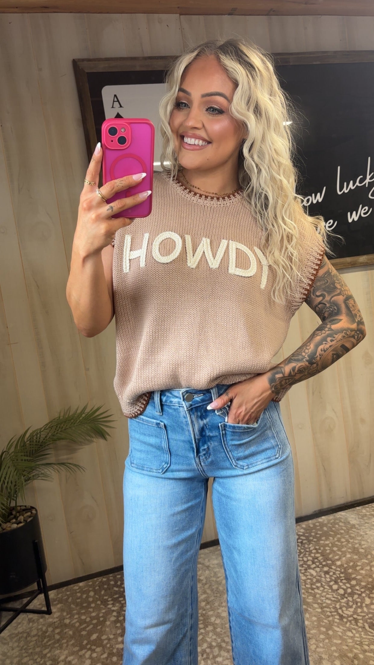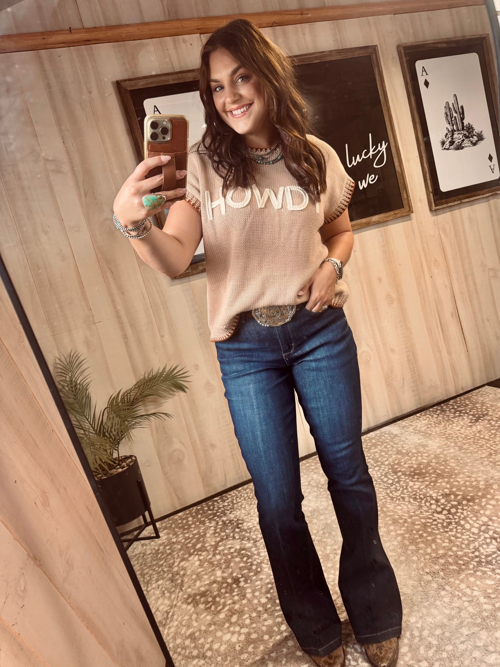 Add a little western charm to your wardrobe with the Howdy Contrast Stitch Sweater. Featuring bold “Howdy” lettering and eye-catching contrast stitching, this sweater blends cozy comfort with standout style. Crafted from a soft cotton-acrylic blend, it’s lightweight yet warm, making it perfect for year-round wear. Pair it with denim and boots for that effortless cowgirl-inspired look.