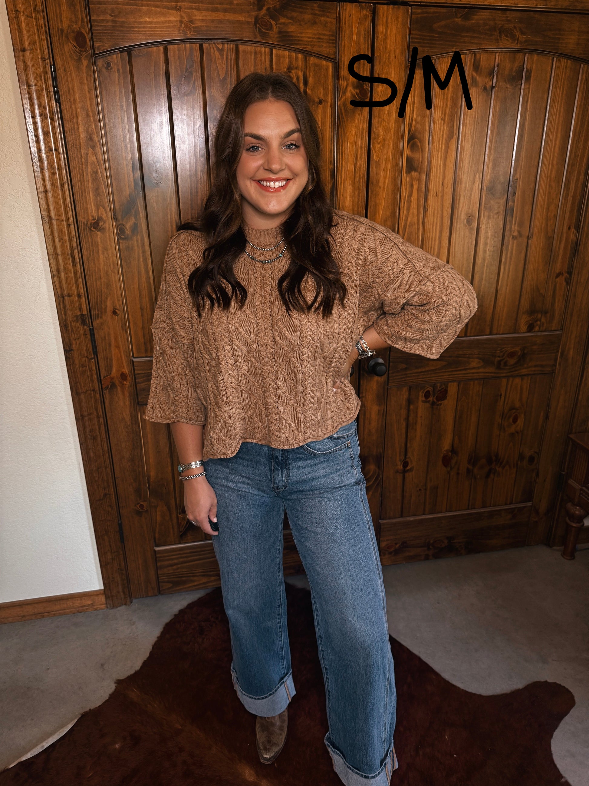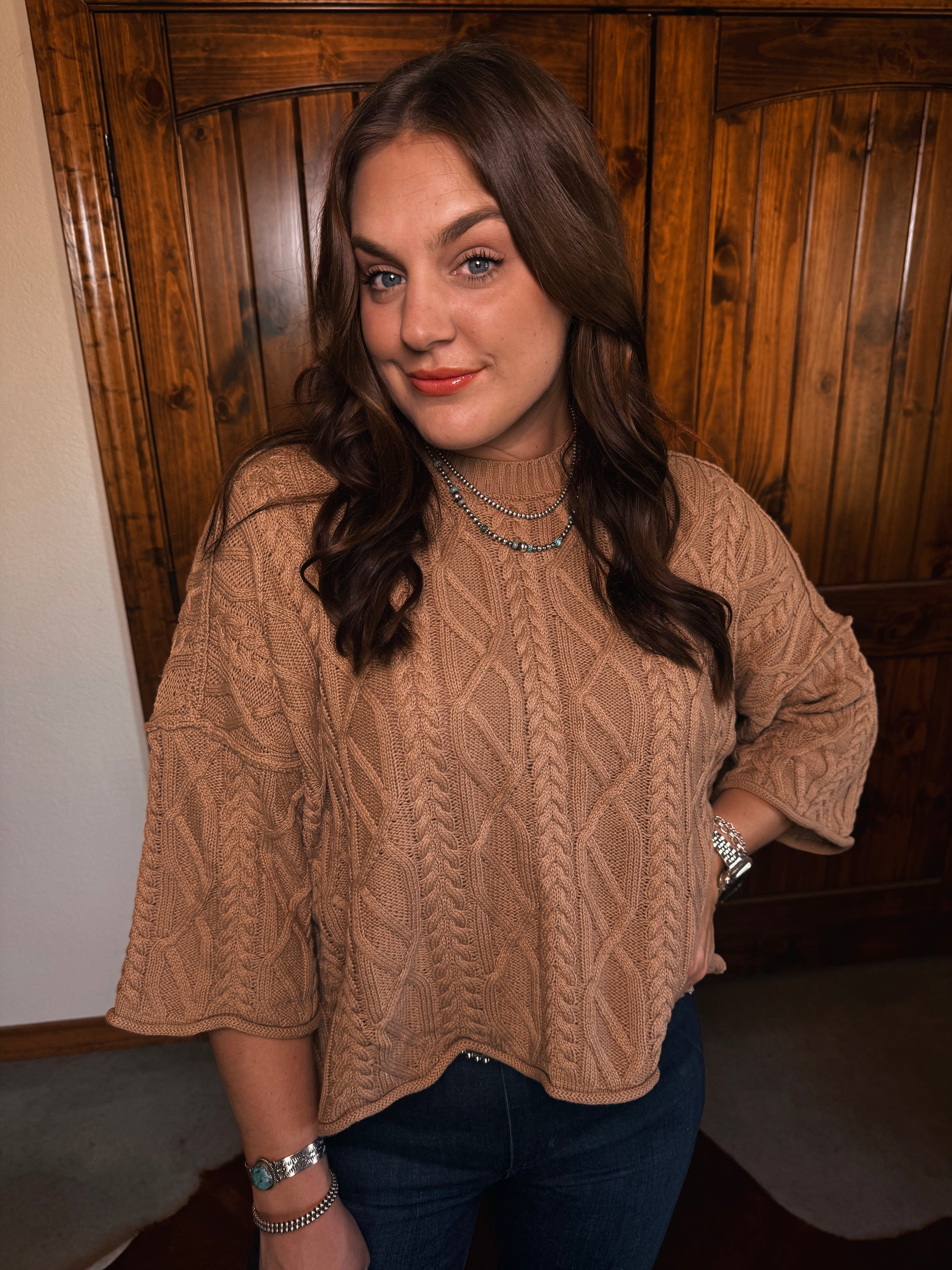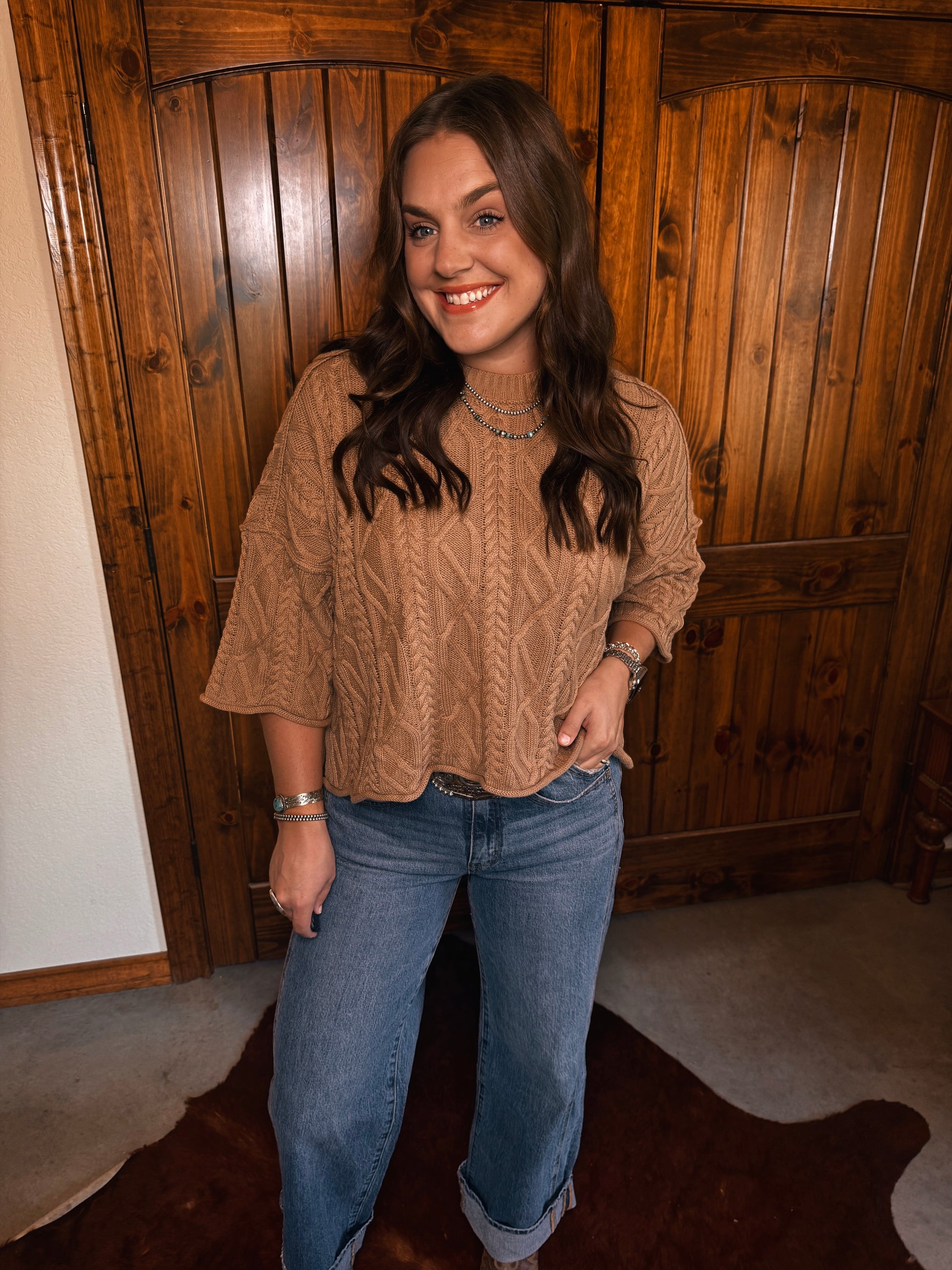 Wrap yourself in cozy Western charm with The Lariat Latte Sweater — a warm, textural piece. Featuring a rich cable knit made up of intricate braids and diamond patterns, this sweater is full of character and handcrafted appeal. Its relaxed silhouette, dropped shoulders, and soft bell sleeves give it a flattering, lived-in feel, while the scalloped hem adds just the right touch.