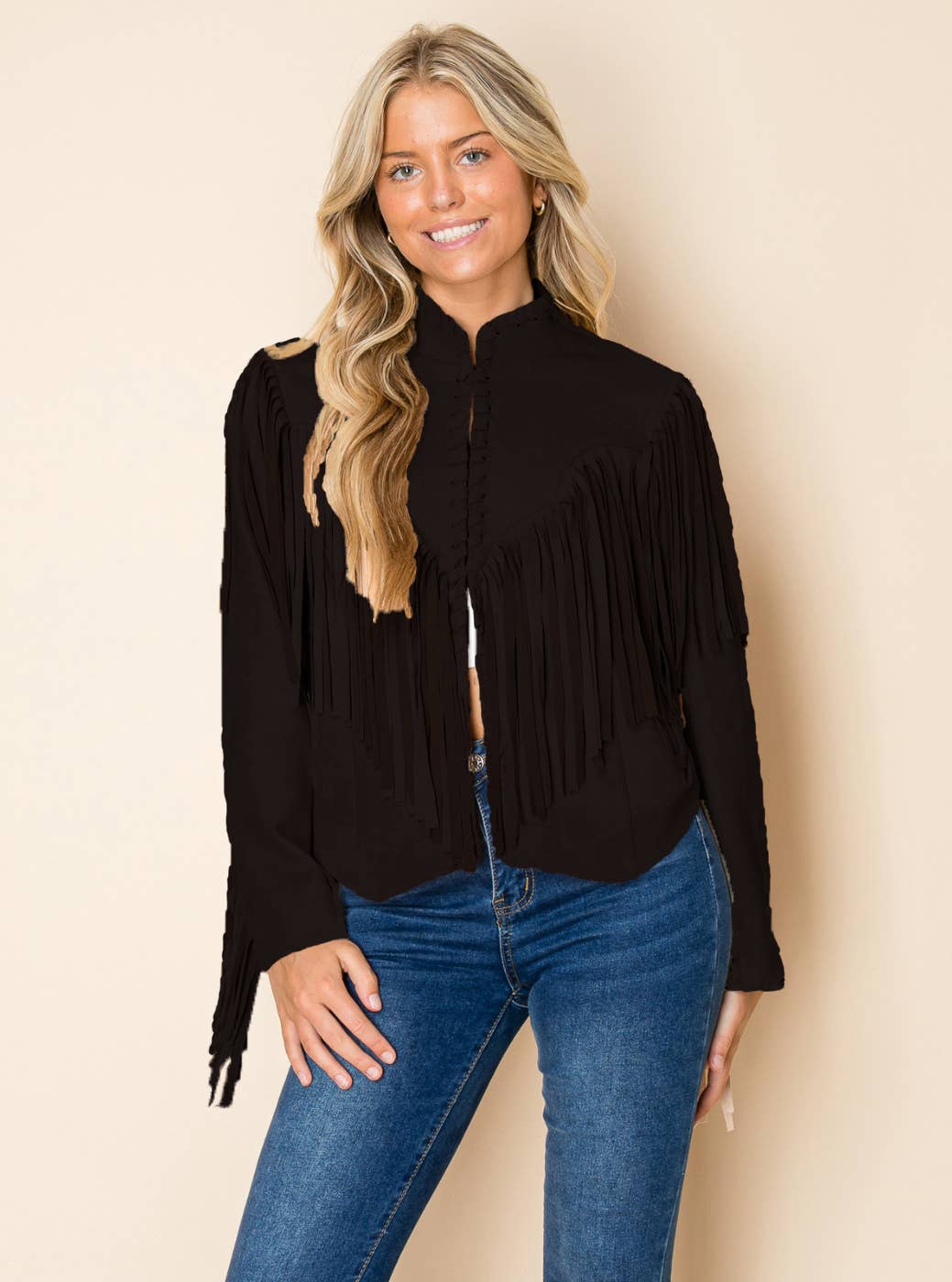 Add a touch of western chic to your wardrobe with the The Black Mesa Jacket — where boho meets modern sophistication. Crafted from ultra-soft washable suede, it features braided detailing along the seams and shoulders with flowing fringe for that perfect statement look. Dress it up for a night out or layer it over your favorite basics for an everyday vibe.